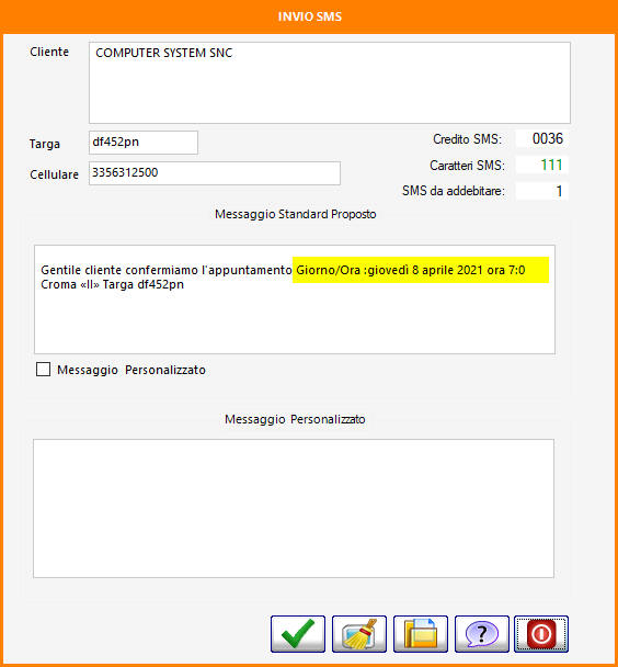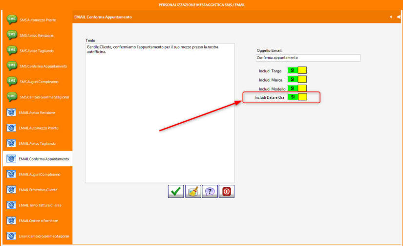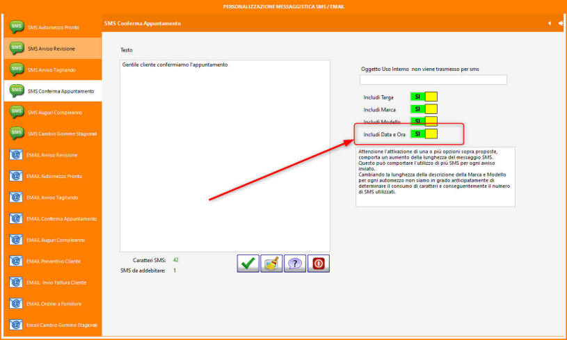 E' possibile tramite Setup definire se nella conferma appuntamento (sms e Email) includere il dettaglio dell'appuntamento (data e ora), facendo attenzione sopratutto nel messaggio sms che l'attivazione di questa opzione puņ comportare un maggiore uso di caratteri comportandone il consumo di 2 sms alla volta.